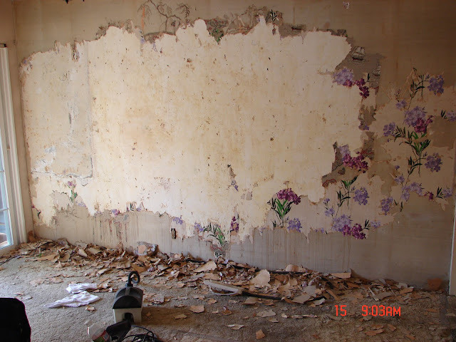 We removed the popcorn ceiling, which tested negative for asbestos, and revealed a relatively blemish free and smooth surface underneath... yay! Guess who removed the first patches: